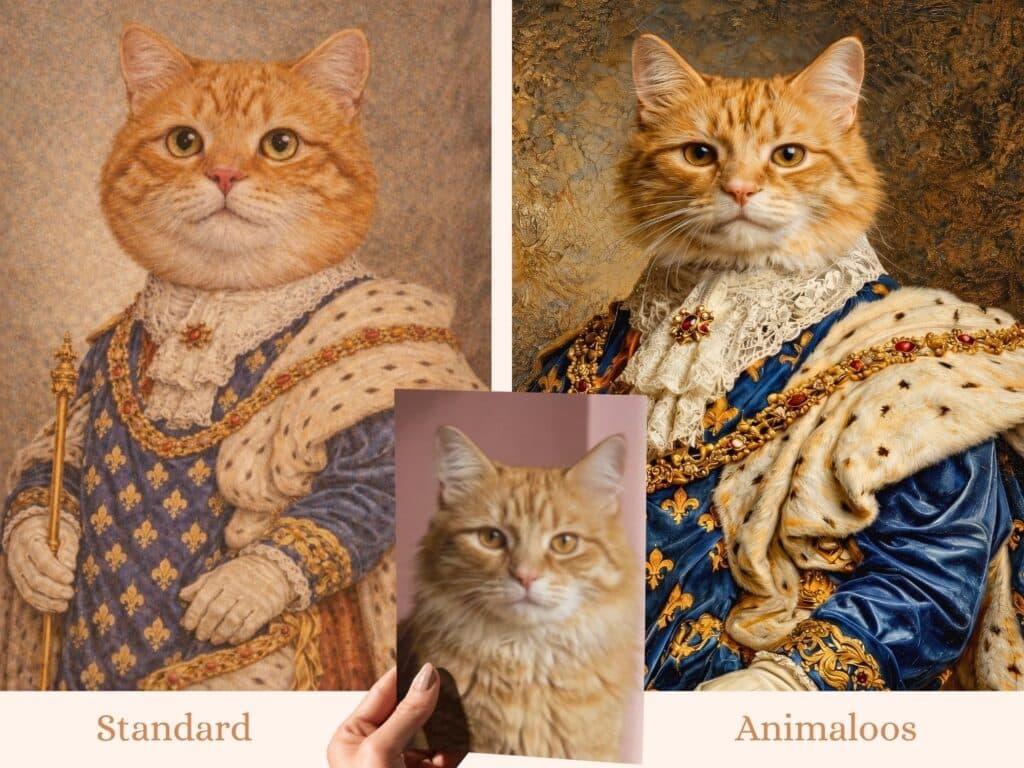 Chaque tableau Animaloos est créé à partir de votre photo, puis soigneusement intégré dans la scène choisie avec un travail précis sur les lumières, ombres, textures et couleurs.